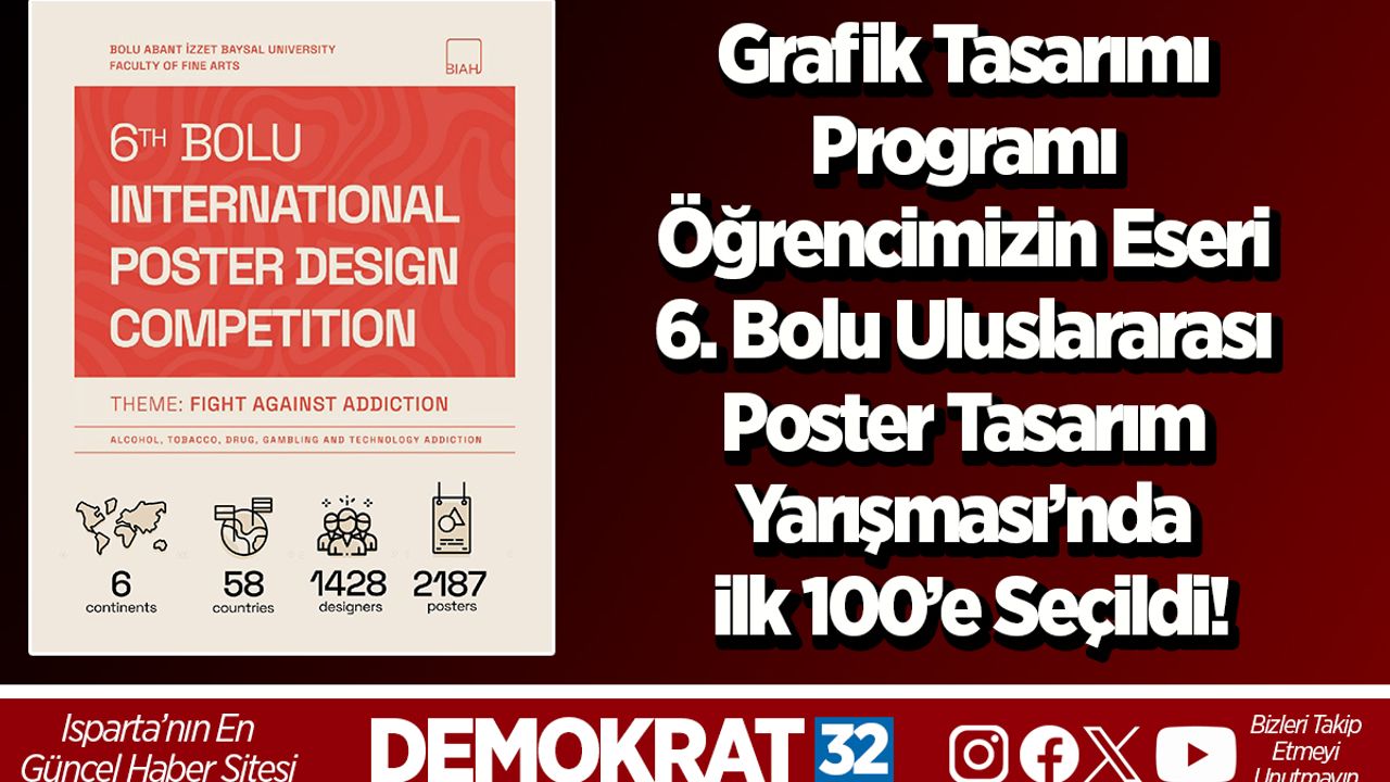Bu yılki teması “Bağımlılığa Karşı Mücadele” olan 6. Bolu Uluslararası Poster Tasarım Yarışması’nın sonuçları açıklanmıştır. Üniversitemiz Uluborlu Selahattin Karasoy MYO Öğrencimiz Tuana Arda KELEŞ'in dijital bağımlılık temalı çalışması, 6 kıta, 58 ülkeden 1428 tasarımcının gönderdiği 2187 adet eserin arasından ilk 100'e seçilmiştir. İlgili organizasyonun jüriliğini 9 ülkeden, 15 profesyonel tasarımcı ve akademisyen üstlenmiştir.