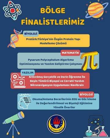 TED Isparta Koleji, ilimizden en fazla projeyle bölge sergisine davet alan okullar sıralamasında geçen yıl olduğu gibi bu yıl da birinci oldu. Mustafa Küçüksille, Mürsel Efe Çalışkan, Atilla Kaan İlkaz Biyoloji dalında ‘Protürk: Türkiye’nin Özgün Protein Yapı Modelleme Çözümü’ Projesi ile, Deniz Gökdoğan, Beril Yalçın Biyoloji dalında ‘Okuma/Anlama Becerilerinin EEG ve Göz İzleme ile Değerlendirilmesi ve Biyoloji Eğitimine Yönelik Öneriler’ Projesi ile, Salih Muaz Demir, Mustafa Altay Çelik, Lacivert Derin Gürpınar Matematik dalında ‘Pysarum Polycephalum Algoritma Optimizasyonu ve Yazılım Geliştirme Çalışması’ Projesi ile, Ensar Demirbilek, Talha Demirbilek, Arda Erdal, Yazılım dalında ‘Artırılmış Gerçeklik Ve Derin Öğrenme İle Beyin Tümörü Biyopsi Ve Cerrahi Yardım Nöronavigasyon Uygulaması: Navibrain ‘ projesi ile bölge finalleri proje sergisine davet edildi.