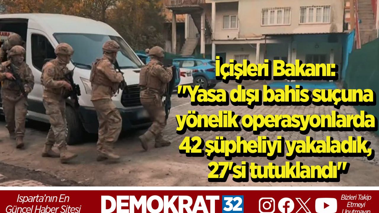 İçişleri Bakanı Ali Yerlikaya, "Yasa dışı bahis suçuna yönelik jandarmamız tarafından düzenlenen operasyonlarımızda son 1,5 yıl içinde hesaplarında 6 milyar 182 milyon lira işlem hacmi bulunan 42 şüpheliyi yakaladık, 27'si tutuklandı" dedi.