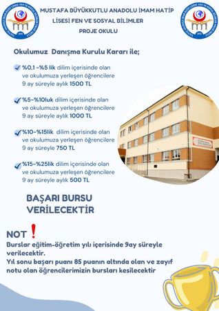 LGS yerleştirme başvurularının başladığı bu dönemde Mustafa Büyükkutlu Anadolu İmam Hatip Lisesi Fen ve Sosyal Bilimler Proje Okulu’nu tercih eden öğrencilere başarı bursunun verileceği duyuruldu.