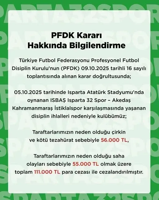 Türkiye Futbol Federasyonu Profesyonel Futbol Disiplin Kurulu’nun (PFDK) 9 Ekim 2025 tarihli toplantısında alınan karar doğrultusunda, Isparta 32 Spor’a toplam 111 bin TL para cezası verildi.