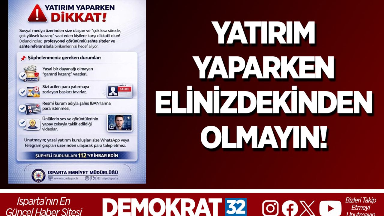 Teknolojinin imkanlarını kullanarak vatandaşları hedef alan dolandırıcılara karşı Isparta Emniyet Müdürlüğü teyakkuza geçti. Sosyal medya hesapları üzerinden kapsamlı bir bilgilendirme notu paylaşan emniyet yetkilileri, özellikle “borsa”, “kripto para” ve “yüksek kazanç” adı altında yapılan tuzaklara dikkat çekti.