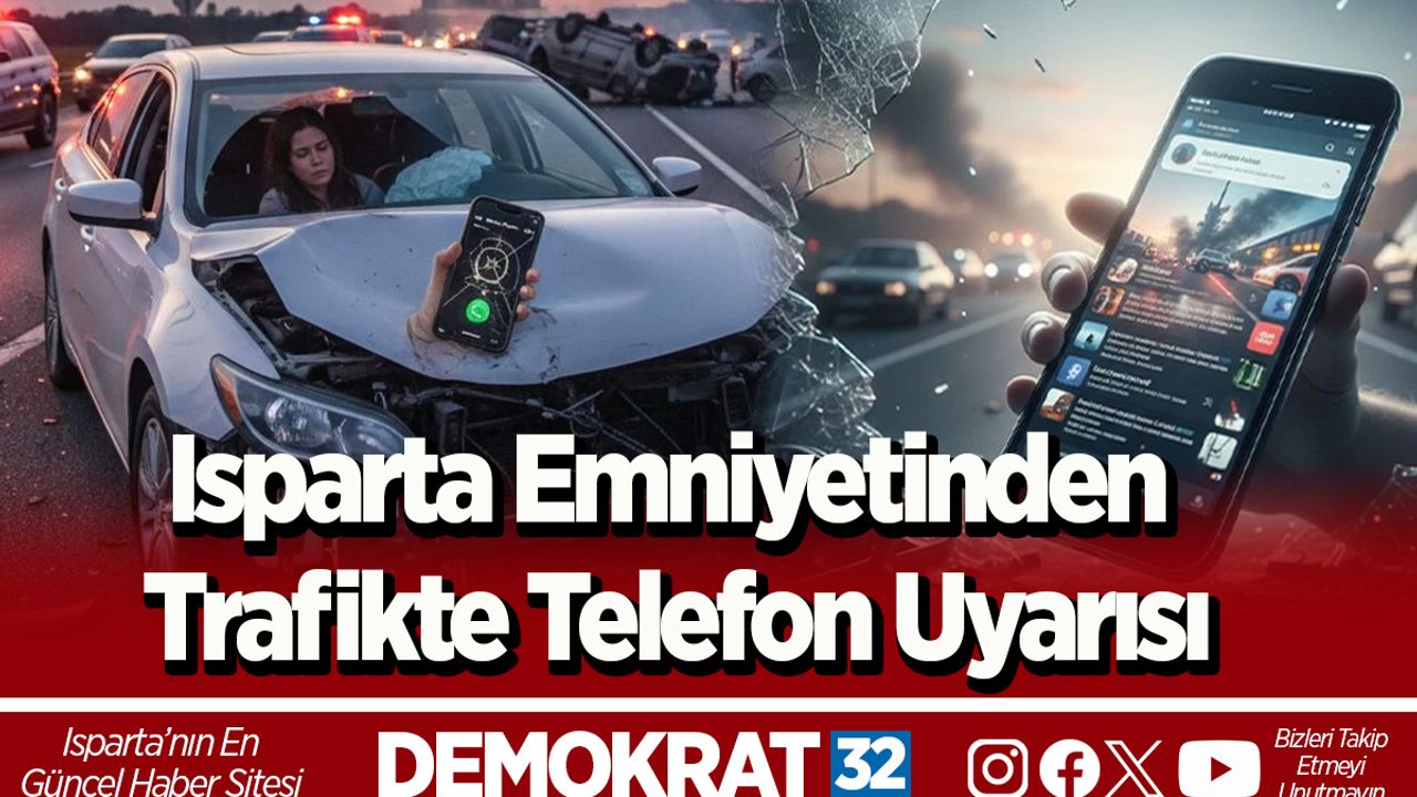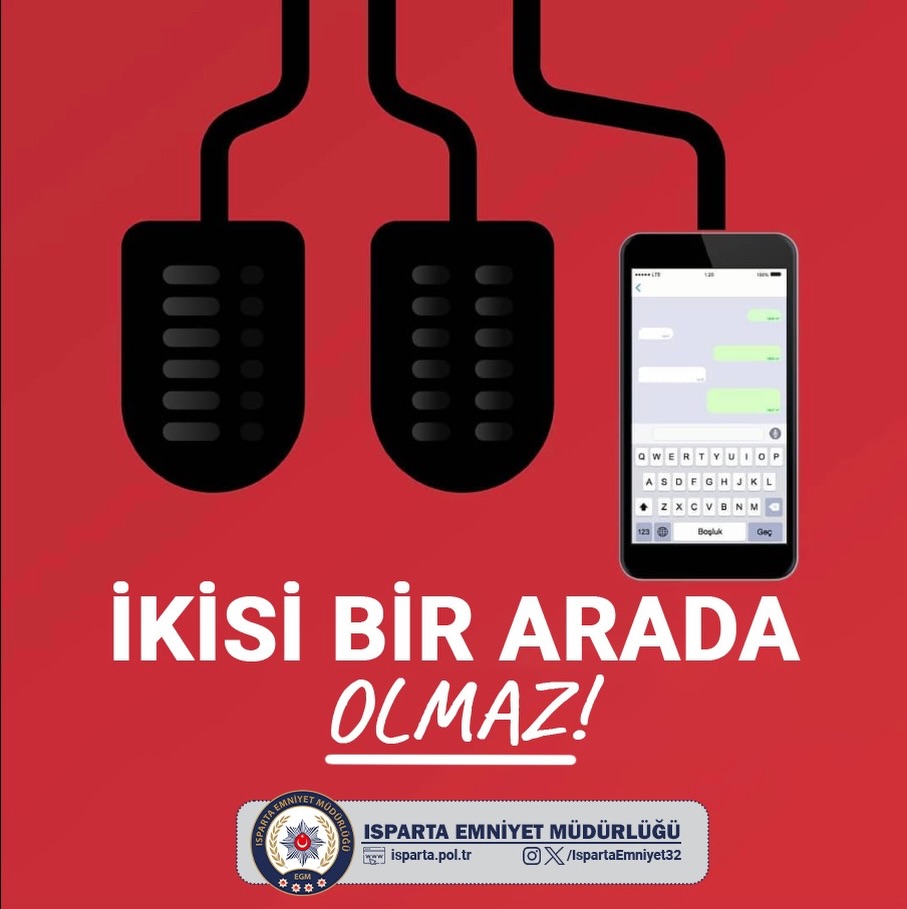 Isparta Emniyet Müdürlüğü, trafikte cep telefonu kullanımının yol açtığı tehlikelere dikkat çekmek amacıyla farkındalık çalışması paylaştı. Sosyal medya üzerinden yayımlanan görselde, araç kullanırken telefonla ilgilenmenin büyük kazalara yol açabileceği vurgulandı.