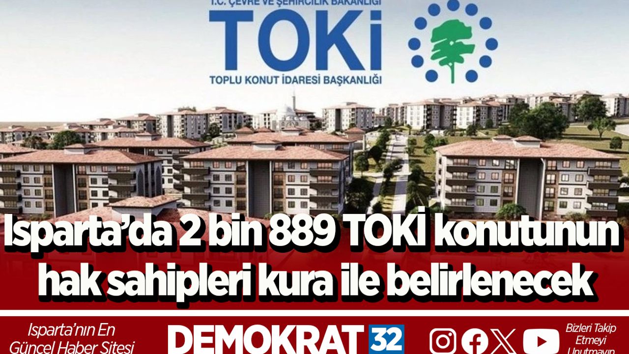 Çevre, Şehircilik ve İklim Değişikliği Bakanlığı, Toplu Konut İdaresi Başkanlığı (TOKİ) tarafından '500 Bin Sosyal Konut Projesi' kapsamında hak sahiplerini belirlemek üzere yapılan kura çekimlerinde sıra Isparta’ya geldi. TOKİ tarafından inşa edilecek Isparta Merkez’de 1300, Kuleönü 200, Aksu 79, Gelendost 63, Gönen 200, Keçiborlu 100, Senir 47, Şarkikaraağaç 400, Yalvaç 400 ve Yenişarbademli 100 olmak üzere Isparta il genelinde toplam 2 bin 889 konutun kura çekimi yapılacak.