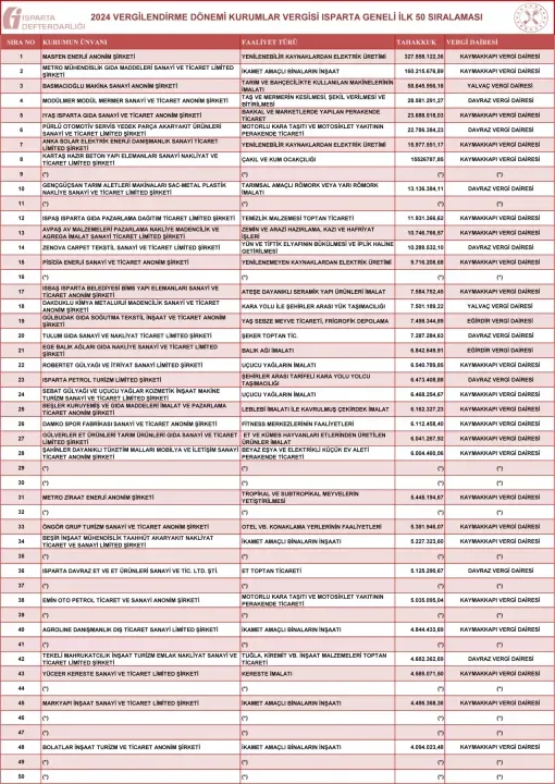 2024 yılı kurumlar vergisi rekortmenleri sıralamasında ilk sırada yer alan firma, Isparta ekonomisine sağladığı katma değer ve yüksek vergi katkısıyla dikkat çekti. Onu, üretim ve ihracat potansiyeliyle öne çıkan diğer firmalar takip etti.