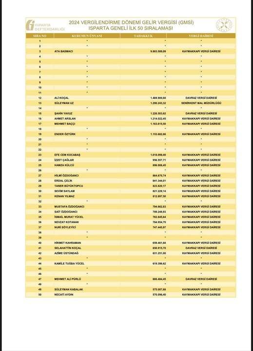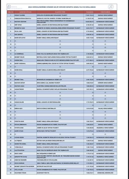 Isparta’da 2024 vergilendirme dönemine ait gelir ve kurumlar vergisi rekortmenleri listesi açıklandı.