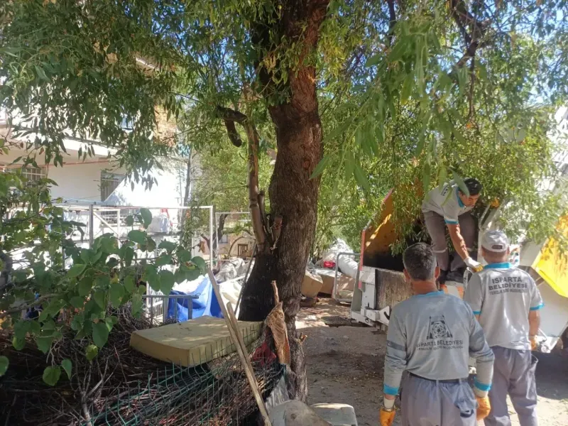 Sidre Mahallesi 4327 Sokak No:8 adresinde bulunan bir çöp ev, Isparta Belediyesi Temizlik İşleri Müdürlüğü ekiplerince boşaltılıyor.