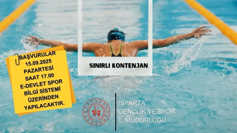 Isparta Gençlik ve Spor İl Müdürlüğü tarafından düzenlenen hobi ve yetişkin yüzme kursları başlıyor. Tahsin Bilginer Yüzme Havuzu’nda gerçekleştirilecek kurslar için başvurular, 15 Eylül 2025 saat 17.00’den itibaren alınacak. Kurslar ise 16 Eylül 2025’te başlayacak.