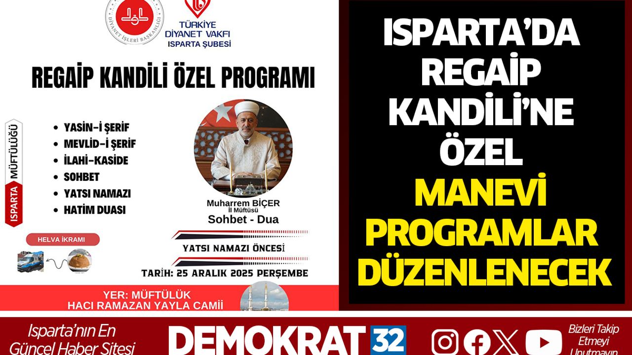 Öte yandan Regaip Kandili dolayısıyla kadınlara özel bir program da düzenlenecek. Isparta Müftülüğü Aile ve Dini Rehberlik Merkezi koordinesinde gerçekleştirilecek program, 25 Aralık Perşembe günü saat 13.30’da, Peygamber Camii (Kavaklı Camii)’nde yapılacak.
