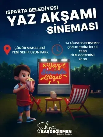 -Isparta Belediyesi, yaz aylarının keyfini vatandaşlarla birlikte yaşamak amacıyla düzenlediği açık hava sinema etkinliklerine devam ediyor. Belediye Başkanı Şükrü Başdeğirmen, 14 Ağustos Perşembe günü Çünür Mahallesi Yeni Şehir Uzun Park’ta gerçekleştirilecek “Yaz Akşamı Sineması” etkinliğine tüm vatandaşları davet etti.