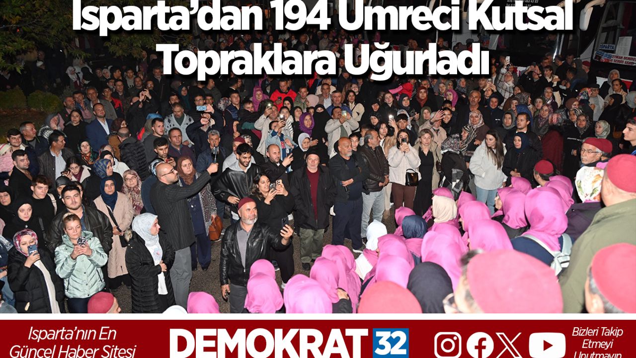 Hudeybiye Turizm öncülüğünde umre ibadeti için kutsal topraklara gidecek 194 kişi için Terminal Camii’nde uğurlama töreni düzenlendi. Düzenlenen törene Isparta Belediye Başkanı Şükrü Başdeğirmen ve eşi Şadiye Başdeğirmen’de katıldı. 194 umreci, dualar eşliğinde kutsal topraklara uğurlandı.