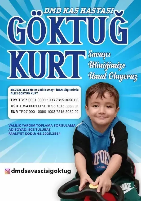 Muğla Milas’ta annesi Ece Tülübaş ile yaşayan Göktuğ’a, henüz 3 aylıkken DMD teşhisi konuldu. Genetik ve ilerleyici kas hastalığı olan DMD’nin tedavisinde umut veren "Elivedys" adlı gen tedavisinin uygulanabilmesi için Göktuğ’un Dubai’ye gitmesi gerekiyor. Ancak bu tedavinin maliyeti yaklaşık 3 milyon dolar.