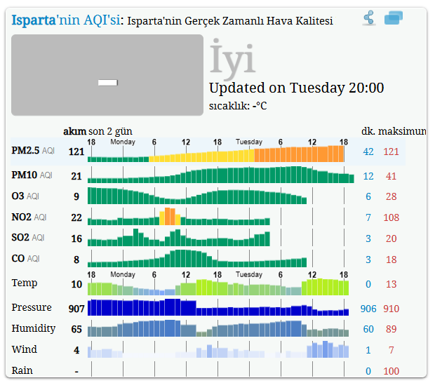 Türkiye genelinde anlık olarak paylaşılan Hava Kalitesi Endeksi (AQI) verilerine göre Isparta’da hava kalitesi genel olarak “iyi” seviyede seyrediyor.
