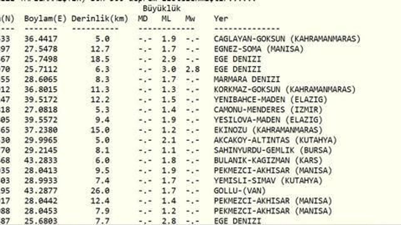KANDİLLİ SON DEPREMLER LİSTESİ- KANDİLLİ RASATHANESİ DEPREM SORGULAMA EKRANI