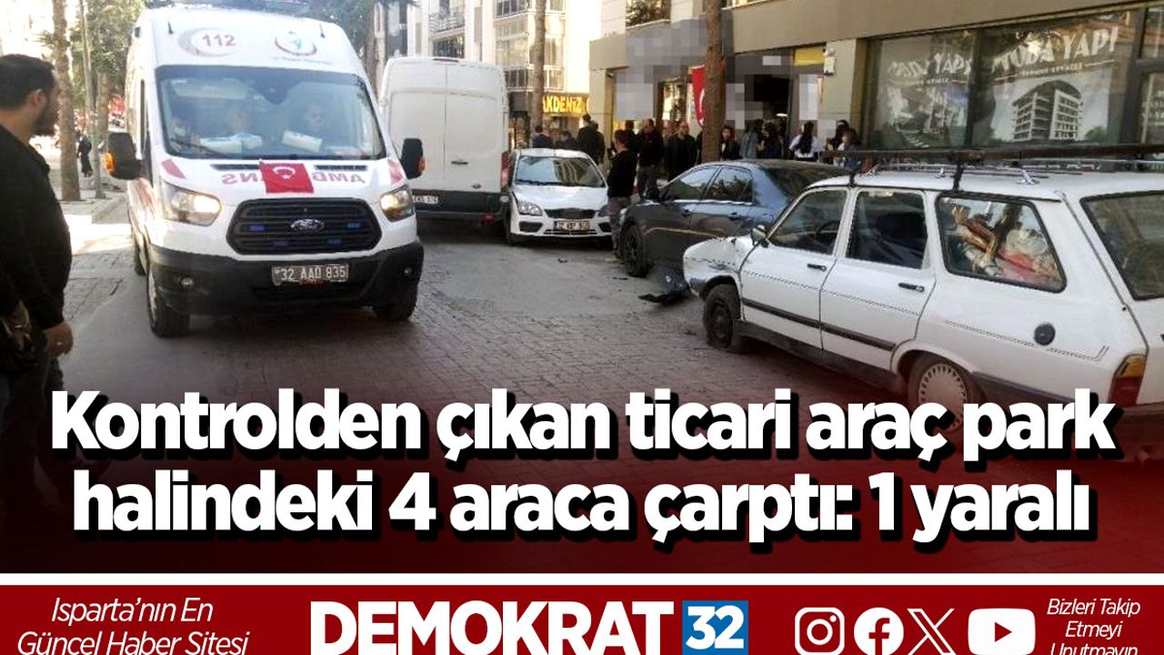 Isparta'nın Yalvaç ilçesinde kontrolden çıkan ticari araç, park halindeki 4 araca çarptı. Kazada 1 kişi hafif şekilde yaralandı.