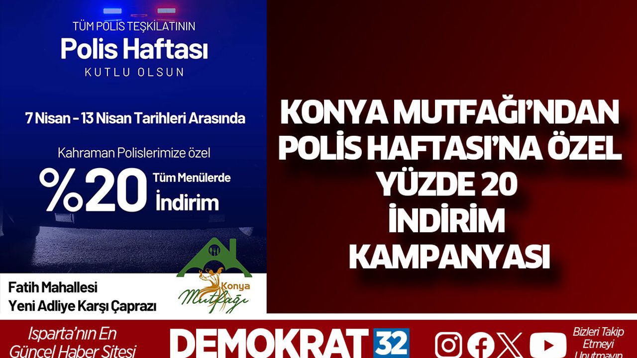 Isparta’da hizmet veren Konya Mutfağı, Polis Haftası dolayısıyla anlamlı bir kampanyaya imza attı. İşletme sahibi Mehmet Turhan adına yapılan açıklamada, Türk Polis Teşkilatı’nın fedakârlıklarına vurgu yapılarak özel bir indirim uygulaması başlatıldığı duyuruldu.