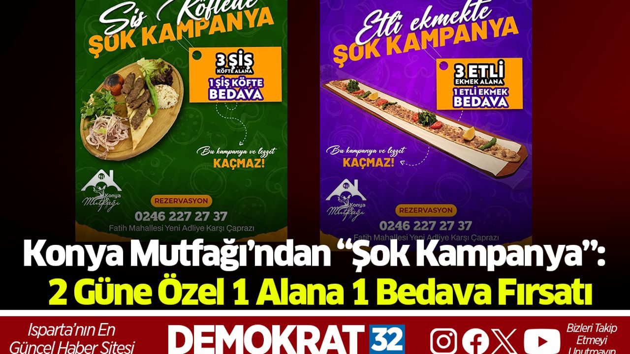 Isparta’da faaliyet gösteren Konya Mutfağı, lezzet tutkunlarına yönelik dikkat çeken bir kampanya başlattı. İşletme, 17-18 Şubat 2026 (Salı-Çarşamba) tarihlerine özel olarak hem şiş köfte hem de etli ekmek ürünlerinde “1 alana 1 bedava” fırsatı sunacak.