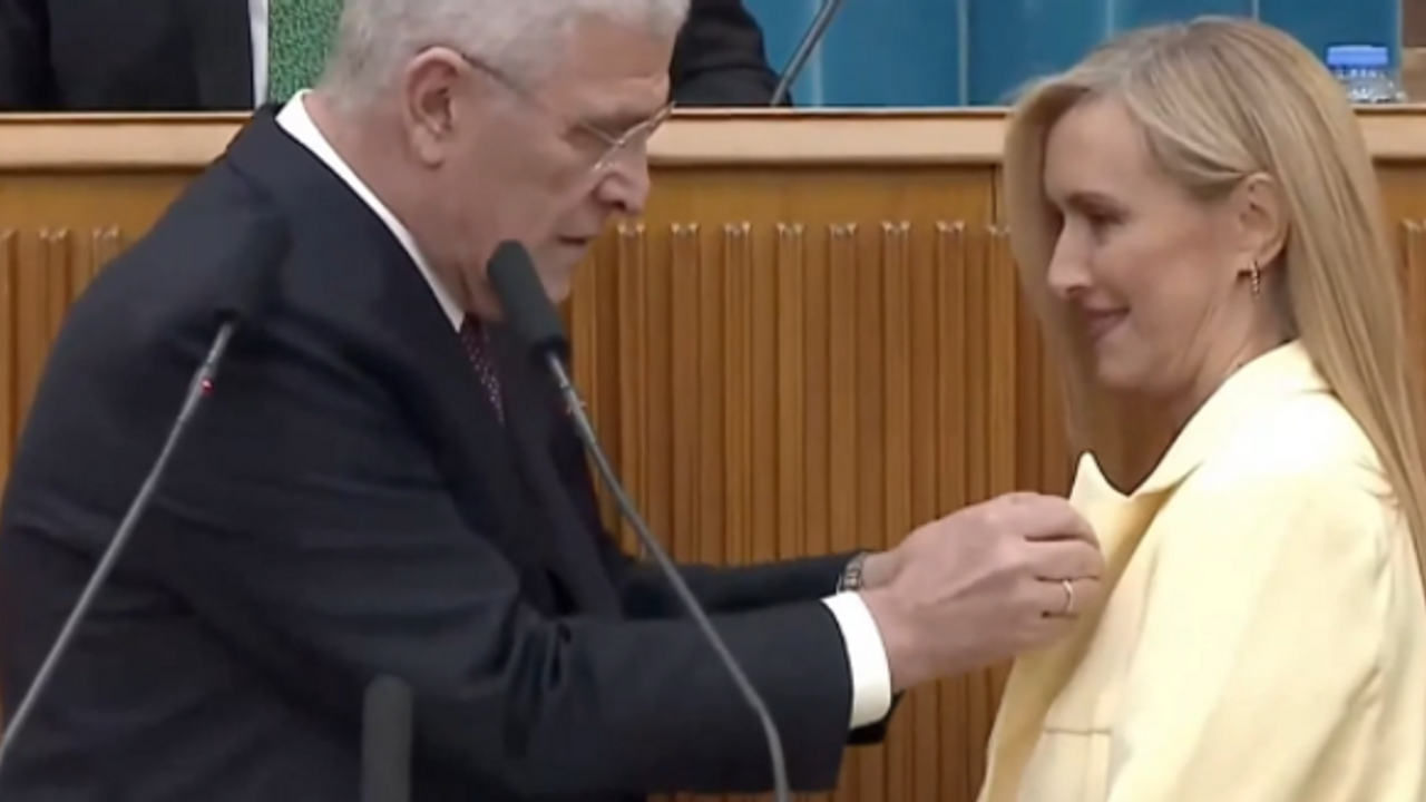 Dervişoğlu, Özkal'a rozetini taktı. Özkal resmen İYİ Partili oldu.