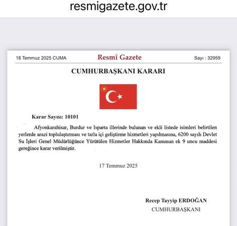 Cumhurbaşkanı Recep Tayyip Erdoğan’ın imzasıyla yayımlanan 17 Temmuz 2025 tarihli Resmî Gazete kararıyla birlikte, Isparta’da arazi toplulaştırma ve tarla içi geliştirme hizmetlerinin kapsamı genişletildi. Karar kapsamında Şarkikaraağaç ve Sütçüler ilçelerindeki toplam 7 köyde çalışmaların başlayacağı duyuruldu.