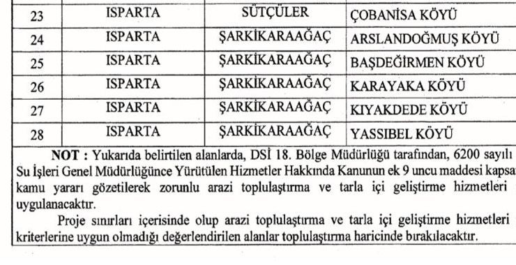 Resmî Gazete’de yer alan karara göre; Isparta’nın Sütçüler ilçesine bağlı Çobanisa Köyü ile Şarkikaraağaç ilçesine bağlı Arslandoğmuş, Başdeğirmen, Karayaka, Kıyakdede, Yassıbel köyleri arazi toplulaştırma kapsamına alındı.