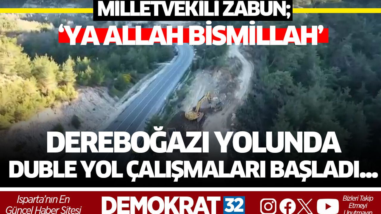 AK Parti Isparta Milletvekili Osman Zabun, yaptığı açıklamada dereboğazı yolunda çalışmanın başladığını duyurdu. Zabun açıklamasında, “Eserlerimizle konuşuyoruz… Ya Allah Bismillah. Isparta–Antalya Dereboğazı duble yol yapımı başladı. Ispartamıza hayırlı olsun” ifadelerini kullandı.Zabun paylaşımında ayrıca Cumhurbaşkanı Recep Tayyip Erdoğan ile Ulaştırma ve Altyapı Bakanı Abdülkadir Uraloğlu başta olmak üzere Karayolları Genel Müdürlüğü ve projede emeği geçenlere teşekkür etti.
