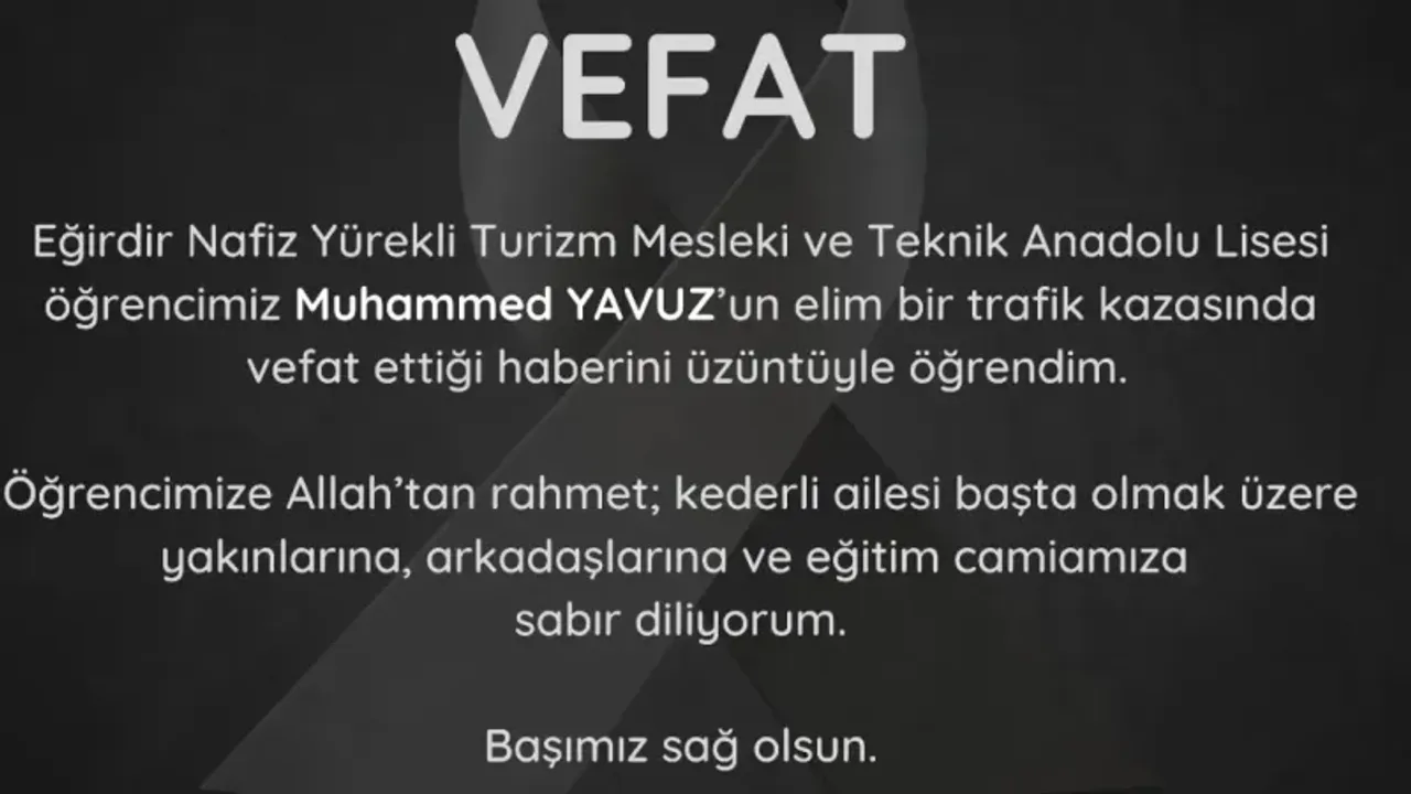 Eğridir Sarıidris kasabasında motosiklet kazasında 16 yaşındaki Muhammet Yavuz’un vefatı Isparta’yı yasa boğarken, Milli Eğitim Müdürü Recai Ocak başsağlığı mesajı yayımladı.