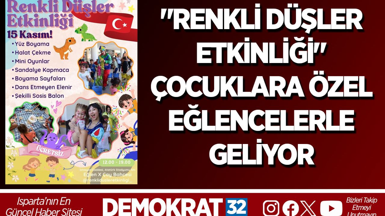 Burak Altıntaş, Adnan İsmail Öztürk ve Azra Demir isimli lise öğrencilerinin organize ettiği Renkli Düşler Etkinliği, 15 Kasım’da çocuklar için eğlenceli bir gün sunacak. Etkinlik, İstasyon Caddesi, Atatürk Stadyumu Altı’ndaki Eğlen X Çay Bahçesi’nde gerçekleştirilecek ve 12:00 ile 19:00 saatleri arasında ücretsiz olarak düzenlenecek.