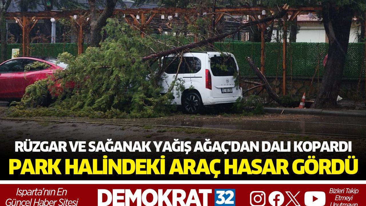 Isparta’da etkili olan kuvvetli rüzgar ve sağanak yağış, Orman Bölge Müdürlüğü önünde bir ağacın dalını kopardı. Kopan dal, yol kenarında park halinde bulunan bir aracın üzerine düştü.