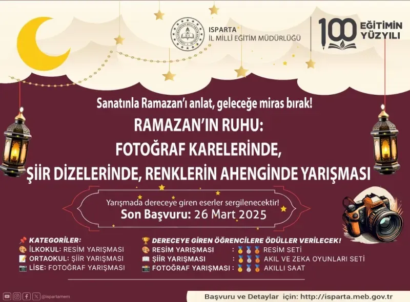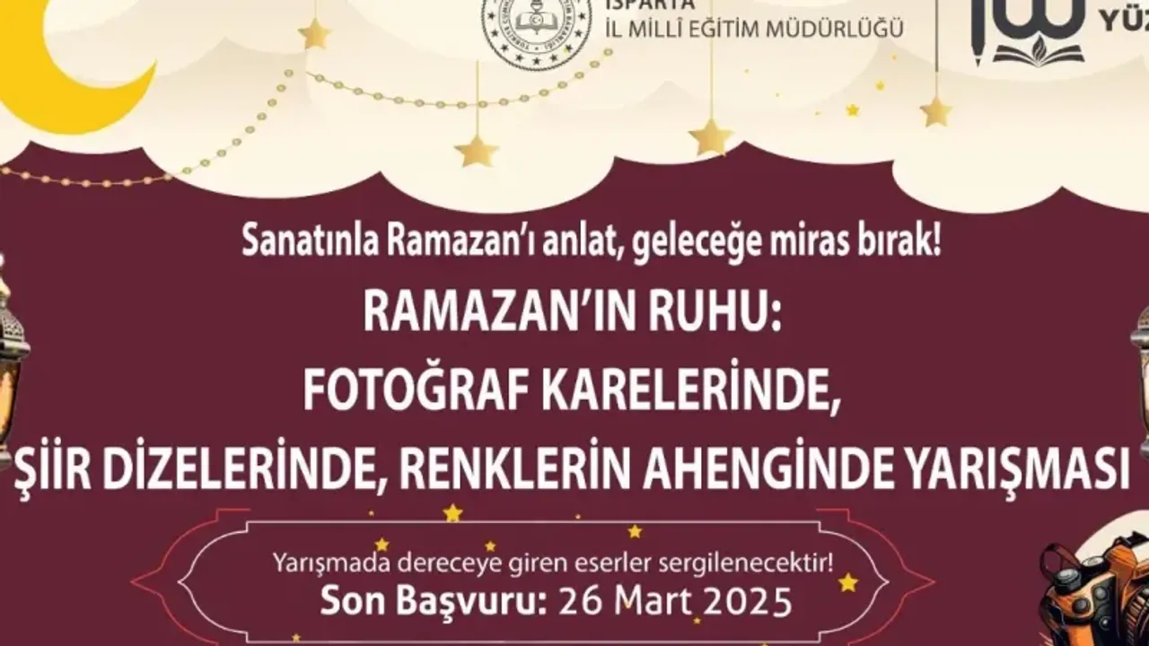 Isparta İl Milli Eğitim Müdürlüğü, öğrencilerin Ramazan ayını sanatla anlatmalarına olanak sağlayan özel bir yarışma düzenliyor. “Ramazan’ın Ruhu: Fotoğraf Karelerinde, Şiir Dizelerinde, Renklerin Ahenginde” temasıyla gerçekleştirilecek yarışma, ilkokul, ortaokul ve lise öğrencilerini kapsıyor.