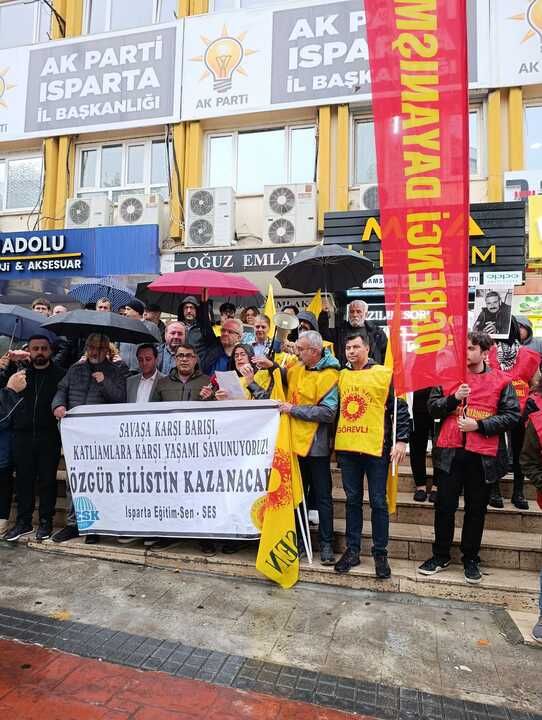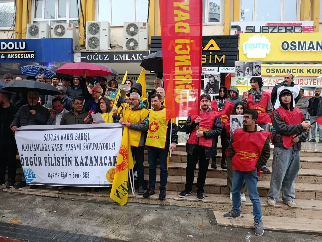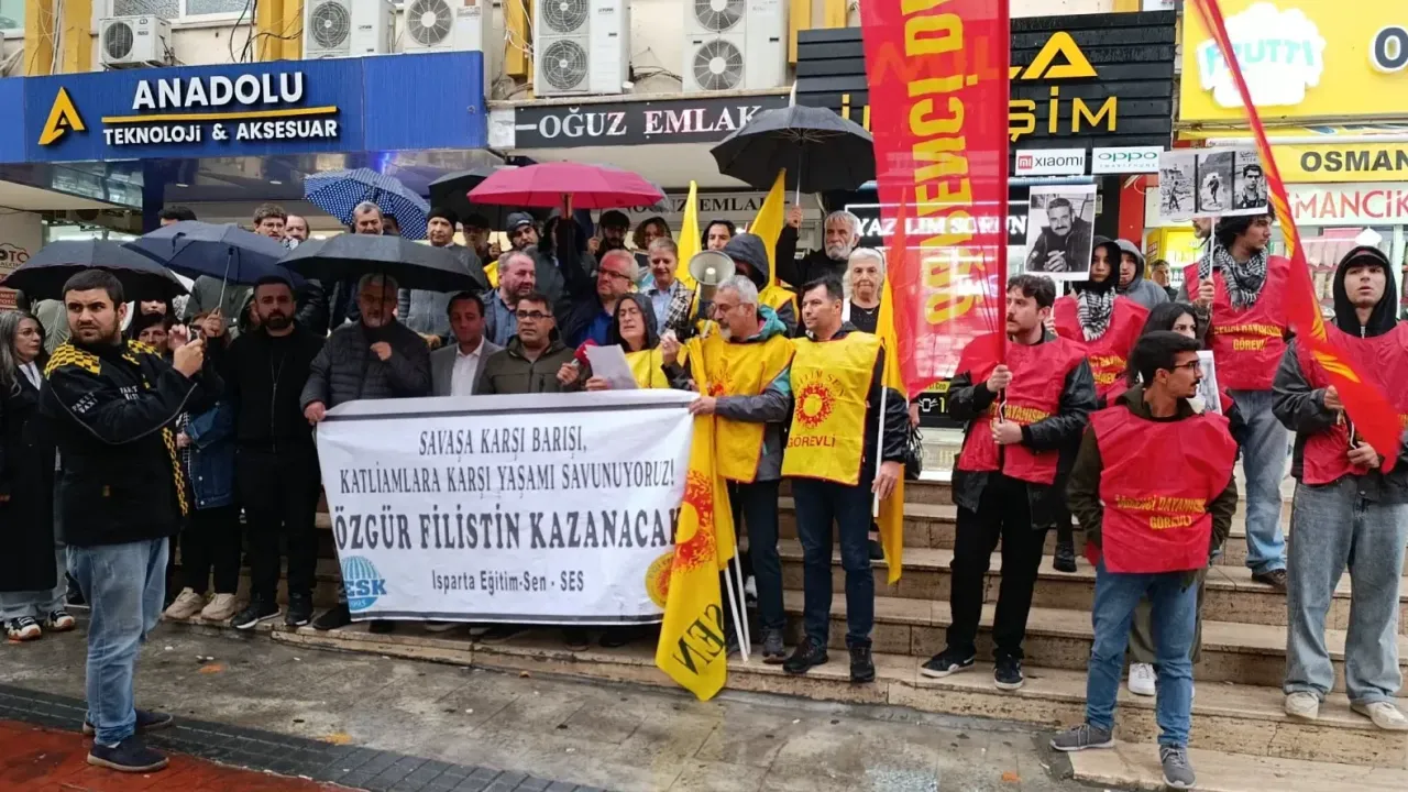 Kaymakkapı Meydanı’nda bir araya gelen Eğitim Sen üyeleri, İsrail’in Gazze’ye yönelik saldırılarını ve Sumud Filosu’na yapılan müdahaleyi protesto etti. Savaş ve soykırım politikalarına karşı Filistin halkının yanında olduklarını vurgulayan Eğitim Sen, hükümete İsrail ile tüm diplomatik ve ticari ilişkilerin kesilmesi çağrısında bulundu. Eğitim Sen Isparta Şube Başkanı Mustafa Turgut şu açıklamaları yaptı: