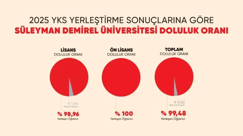 Öğrenci Seçme ve Yerleştirme Merkezi (ÖSYM) tarafından gerçekleştirilen Yükseköğretim Kurumları Sınavı (YKS) yerleştirme sonuçları açıklandı. Sonuçlara göre bu yıl Üniversitemize 4 bin 140 öğrenci kayıt yaptırmaya hak kazandı. SDÜ’nün ön lisans doluluk oranı yüzde 100, lisans doluluk oranı yüzde 98,96 iken; tüm kontenjanlar dâhil doluluk oranı da yüzde 99,48 oldu.