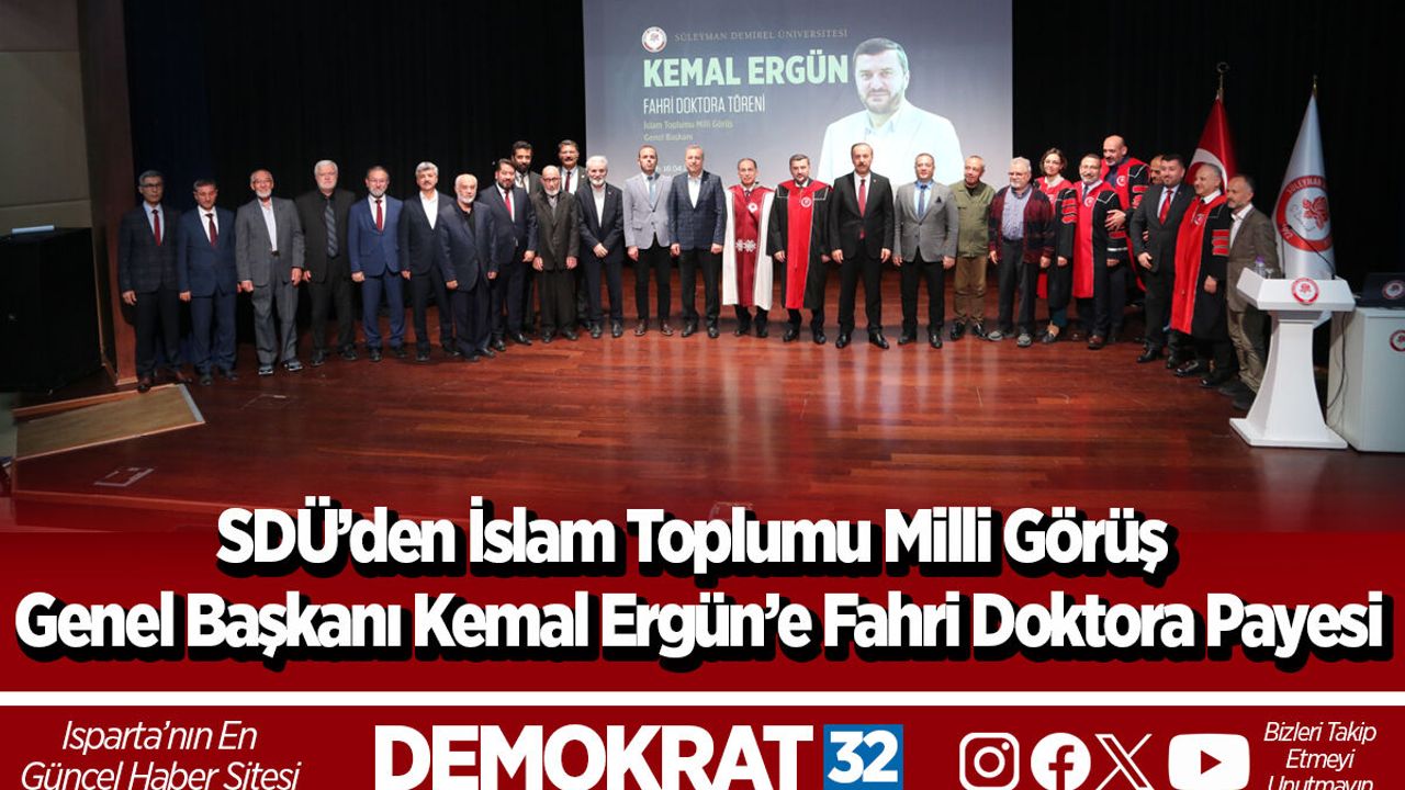 Süleyman Demirel Üniversitesi tarafından, İslam Toplumu Milli Görüş Genel Başkanı Kemal Ergün’e, toplumsal ve kültürel alanlarda gerçekleştirdiği çalışmalar, gençlerin eğitimi, kültürel kimliğin korunması ve toplumsal sorumluluk bilincinin güçlendirilmesine yönelik yaptığı çalışmalar dolayısıyla “Fahri Doktora” payesi verildi.