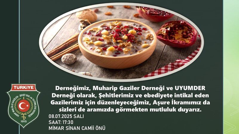Etkinlik, 8 Temmuz Salı günü (bugün) saat 17.30’da Mimar Sinan Camii önünde gerçekleştirilecek. Dernek yetkilileri, tüm vatandaşları düzenlenecek programa davet ederek, “Şehitlerimiz ve gazilerimiz için düzenleyeceğimiz aşure ikramımızda sizleri de aramızda görmekten mutluluk duyarız” mesajını paylaştı.