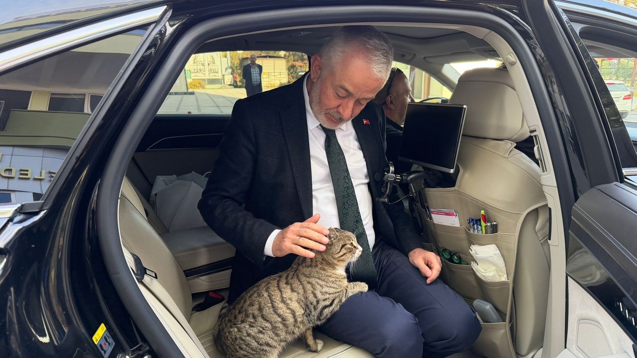 Sokak hayvanlarına yönelik sevgisiyle de bilinen Belediye Başkanı Şükrü Başdeğirmen’in dün sürpriz bir misafiri vardı. Bir sokak kedisi, Ankara’ya gitmek için makam arabasına binen Başdeğirmen’in yanına oturdu.