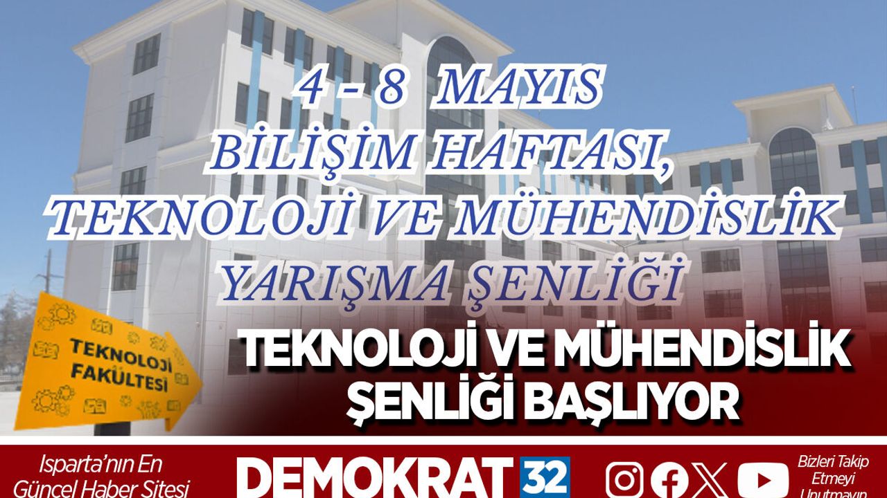 Isparta Uygulamalı Bilimler Üniversitesi Teknoloji Fakültesi tarafından düzenlenen “2026 Bilişim Haftası Teknoloji ve Mühendislik Yarışma Şenliği”, 4-8 Mayıs 2026 tarihleri arasında gerçekleştirilecek. Gençlik ve Spor Bakanlığı desteğiyle hayata geçirilen etkinlikte, öğrenciler ve teknoloji meraklıları birçok yarışma ve organizasyonda bir araya gelecek.