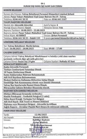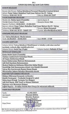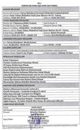 Başvuruların Yalvaç Belediyesi’ne şahsen yapılması gerekiyor. İŞKUR tarafından yayımlanan ilan ile ilgili tüm detaylar da duyuruda yer aldı.