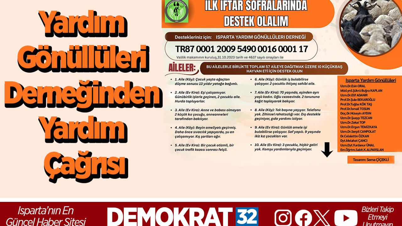 Isparta Yardım Gönüllüleri Derneği, Ramazan ayının ilk iftar sofralarında ihtiyaç sahibi ailelere destek olmak amacıyla yardım kampanyası başlattı. Dernek tarafından yapılan açıklamada, kent genelinde belirlenen 57 aileye dağıtılmak üzere 10 küçükbaş hayvan eti temini için destek çağrısında bulunuldu.