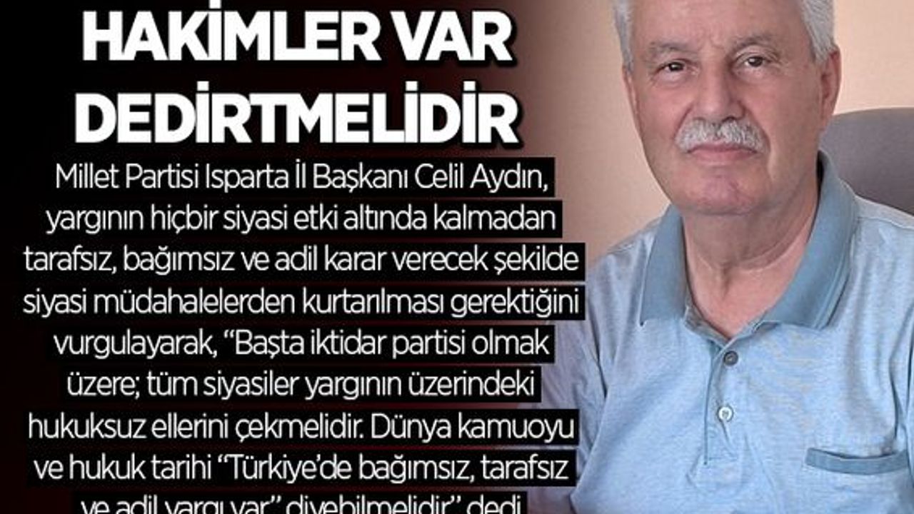 Millet Partisi Isparta İl Başkanı Celil Aydın, yargının hiçbir siyasi etki altında kalmadan tarafsız, bağımsız ve adil karar verecek şekilde siyasi müdahalelerden kurtarılması gerektiğini vurgulayarak, “Başta iktidar partisi olmak üzere; tüm siyasiler yargının üzerindeki hukuksuz ellerini çekmelidir. Dünya kamuoyu ve hukuk tarihi “Türkiye’de bağımsız, tarafsız ve adil yargı var” diyebilmelidir” dedi